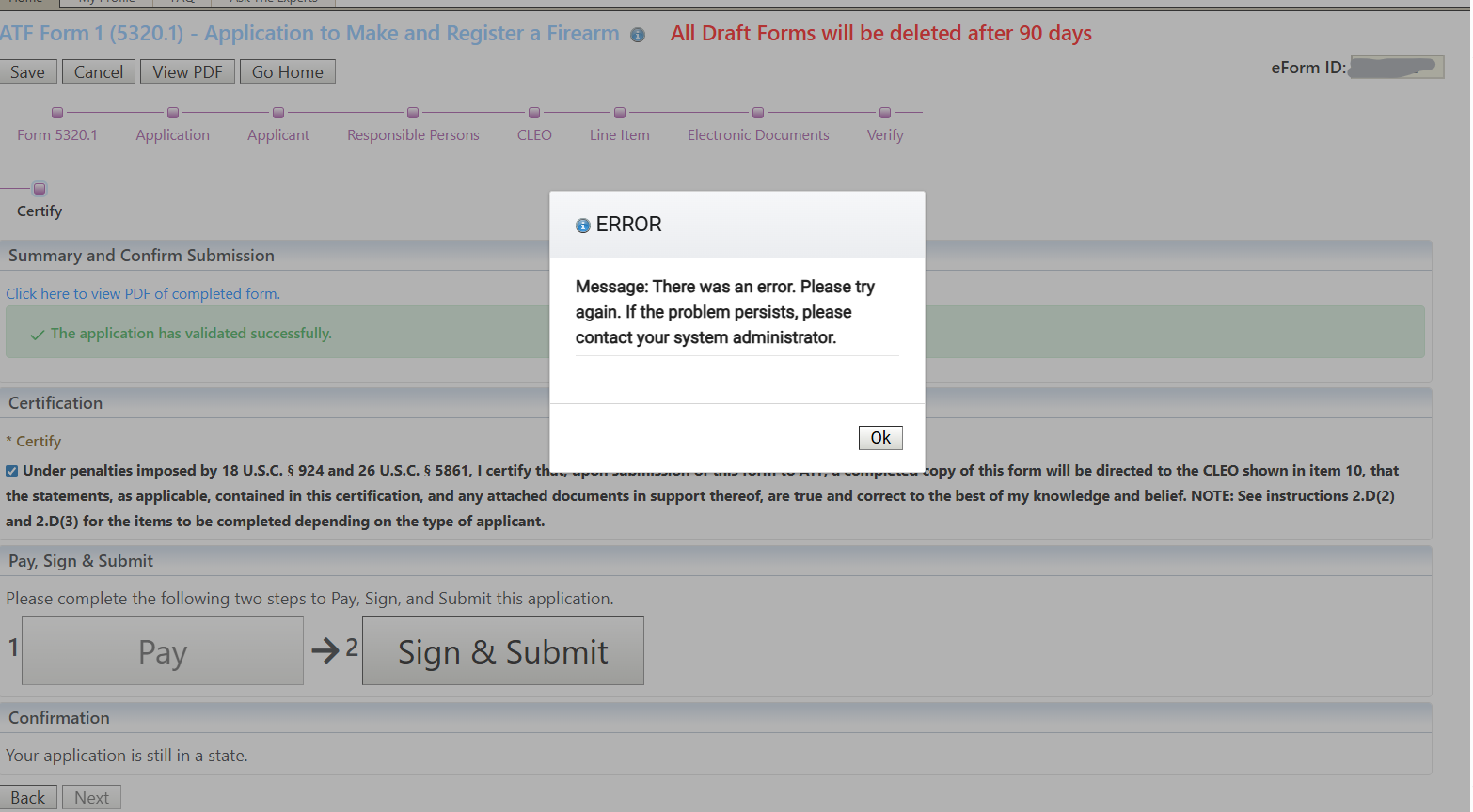 I have submitted multiple SBR applications in the past and never encountered errors with the ATF eForm website. It was ridiculously slow and clunky, just like every other government website, but it worked.